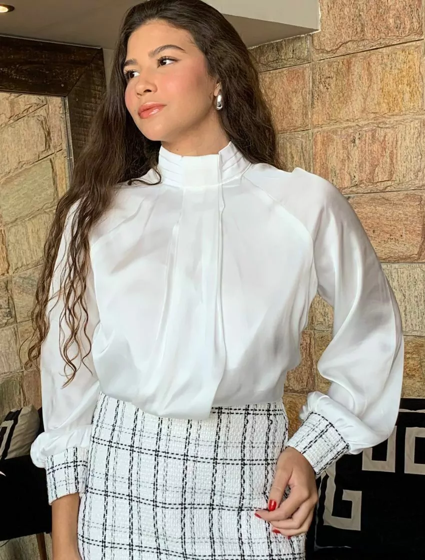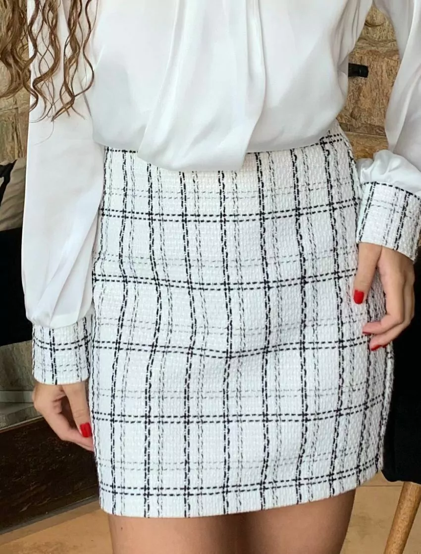 Vestido curto com mangas longas e um lindo contraste de tecidos. A parte superior é em cetim com um charmoso laço na gola, enquanto a saia é em tweed. Uma peça clássica e super elegante, com detalhe de zíper nas costas. O modelo não possui bojo ou forro.